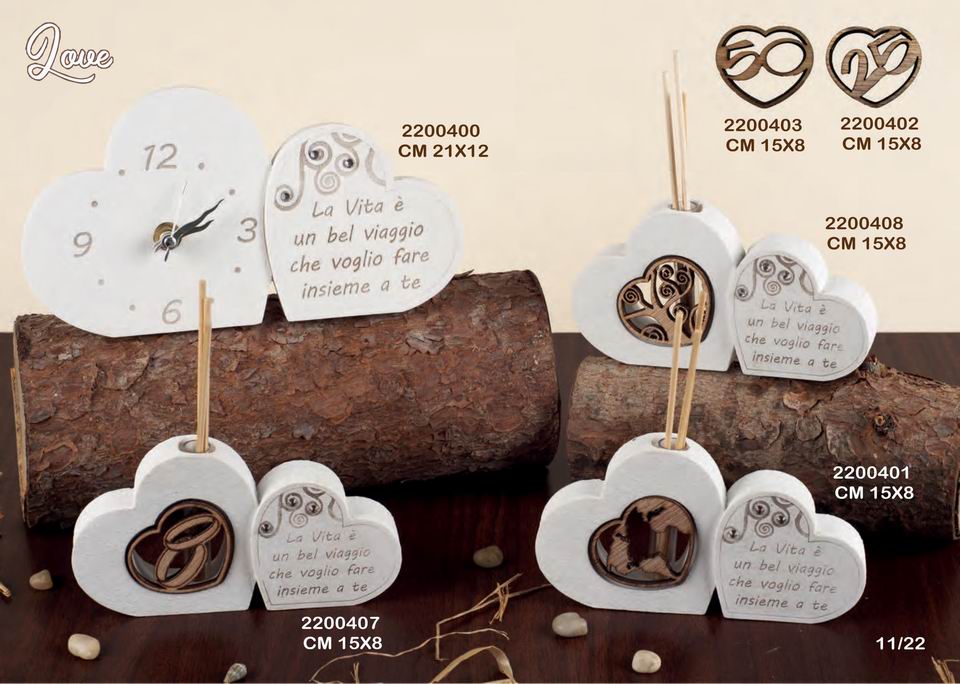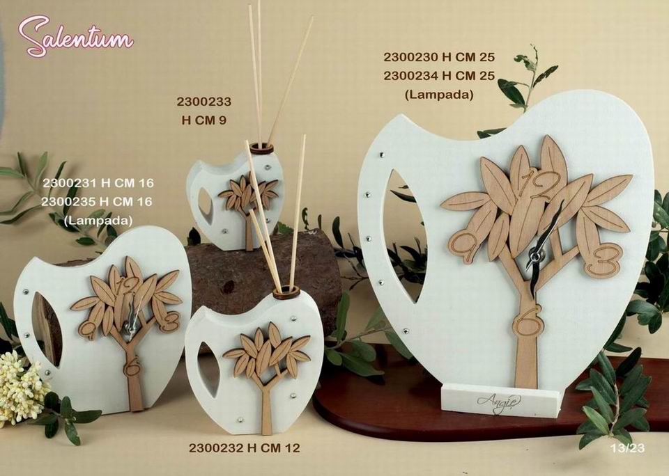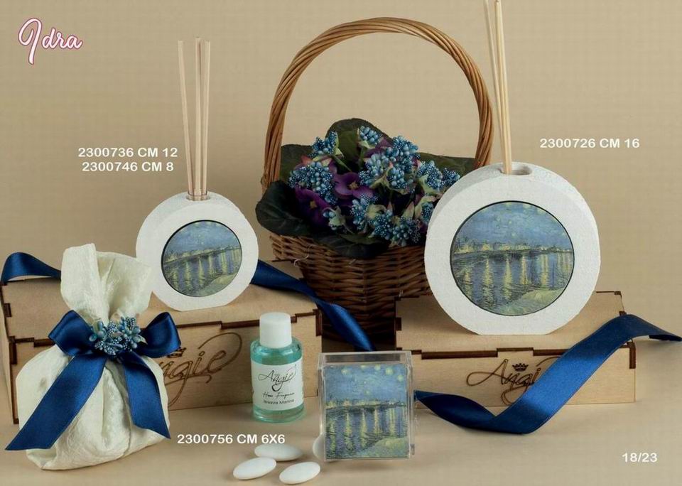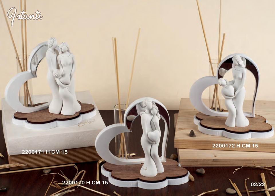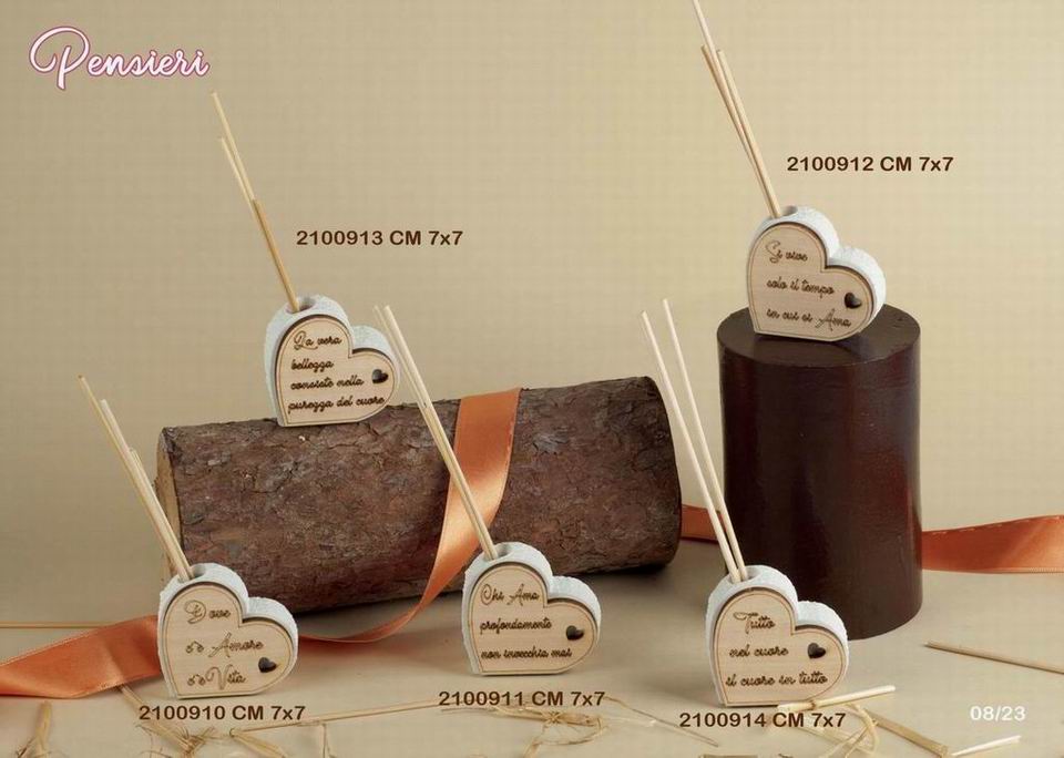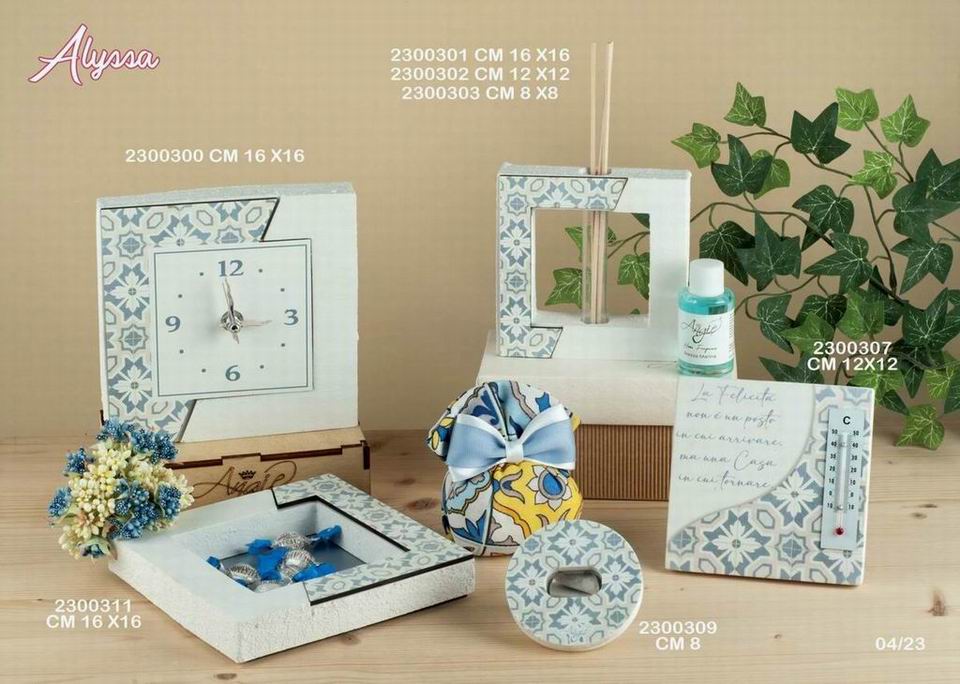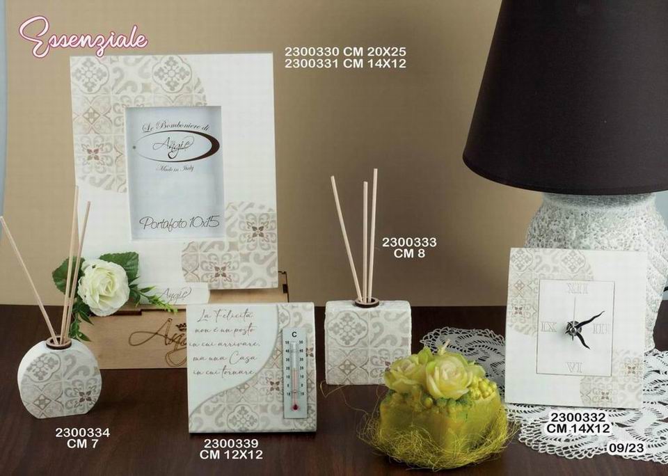 Produce bomboniere e articoli da regalo rigorosamente Made in Italy utilizzando materiali pregiati come polvere di marmo di Carrara e piuma di pietra leccese, decorati a mano completate da inserti in legno incisi al laser, plexiglass etc. Dove previsto, gli articoli sono muniti di accessori quali essenze profumate e midollini.
